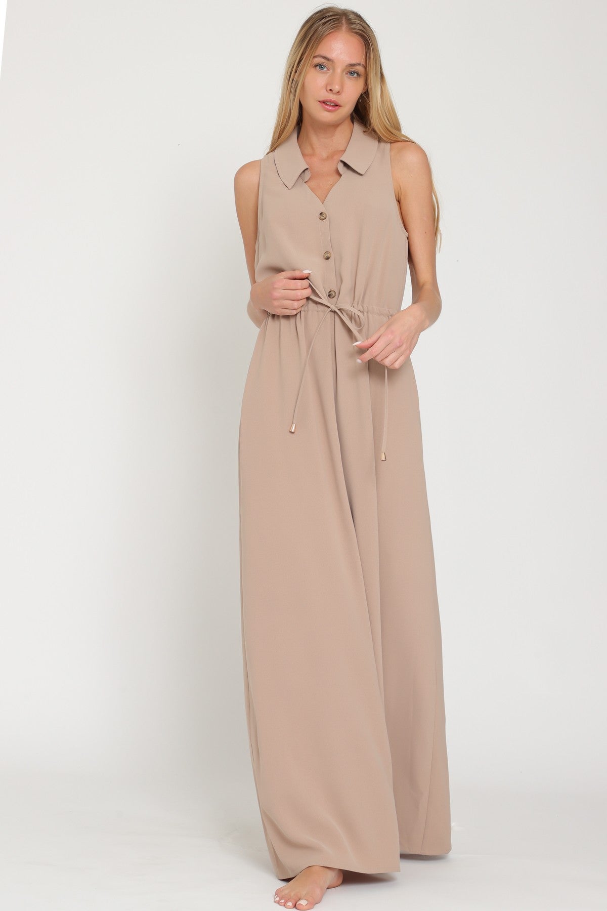 Timeless, understated, and effortlessly stylish. This neutral-toned jumpsuit offers chic comfort with a button-down front, a structured collar, and an adjustable waist tie for a tailored silhouette. Equipped with convenient pockets and a wide-leg design, it combines functionality with refined fashion. Made from 100% polyester for durability and ease. True to size.