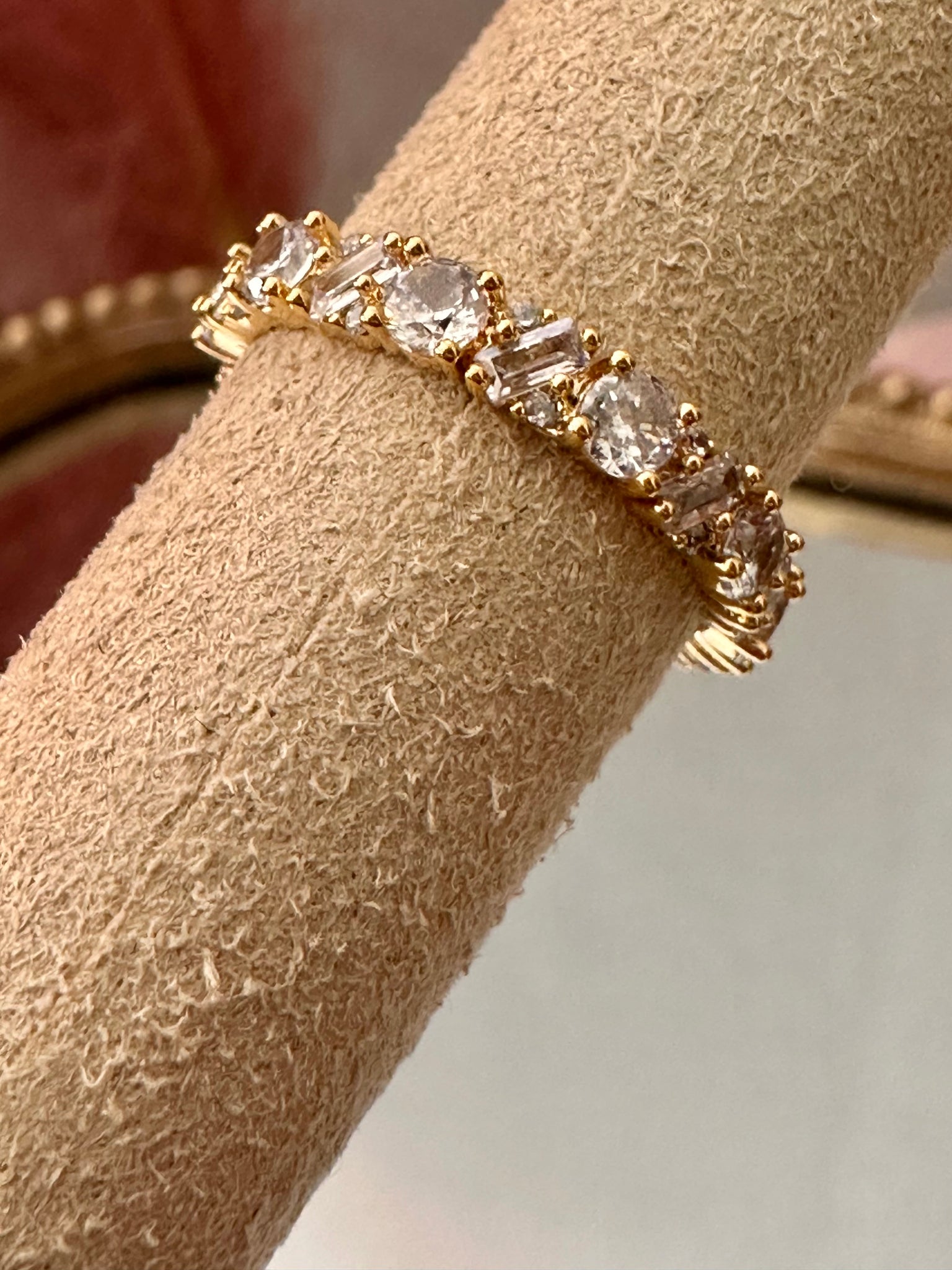Shine from every angle with The Starlight Ring, a gold-dipped eternity band featuring a stunning mix of round and baguette-cut stones. This timeless design radiates luxury and elegance, making it the perfect statement piece whether worn solo or stacked with your favorites.